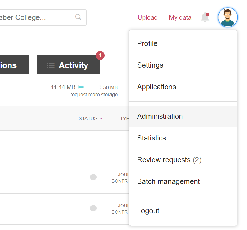 Click on the account icon in the upper right corner to see a dropdown of options. In the profile option you can add bibliographic information and upload an image. The Settings option is where password information is managed, if applicable. The Applications option is where you can connect your account to ORCID, get FTP credentials, and create API tokens. As an Administrator, you will next see Administration and Statistics. If you have review privileges, you'll see Review requests, and if you are a top level administrator (i.e. you are and admin in the very top group), you will see a Batch management option.