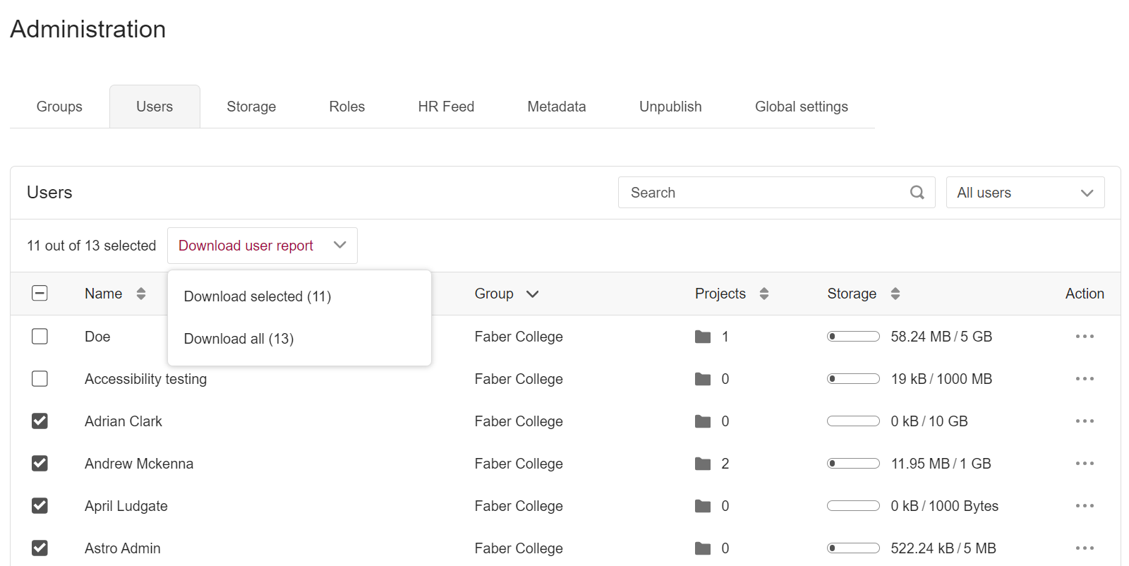 You can also download user reports for a number of users at once. To download a report for multiple users, select all the users that you wish to include in the report. This will then reveal a dropdown where you can choose to “Download selected” this will download a user report for all the selected users, or “Download all”, this will download a user report for all users.